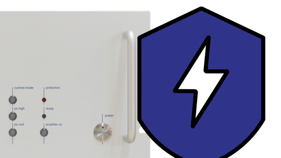 If a dangerous voltage value occurs at the amplifier output, the option internally short-circuits the output via two silicon diode paths. The voltage then drops to approx. 1.5...2 V. The short-term current peak may reach 2,000 A for a period of 10 ms (with any polarity). At the same time, the amplifier is switched off.
